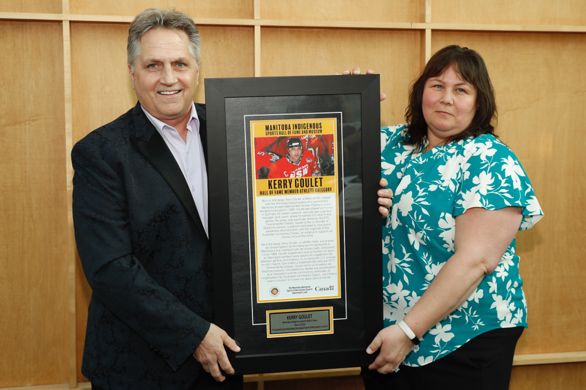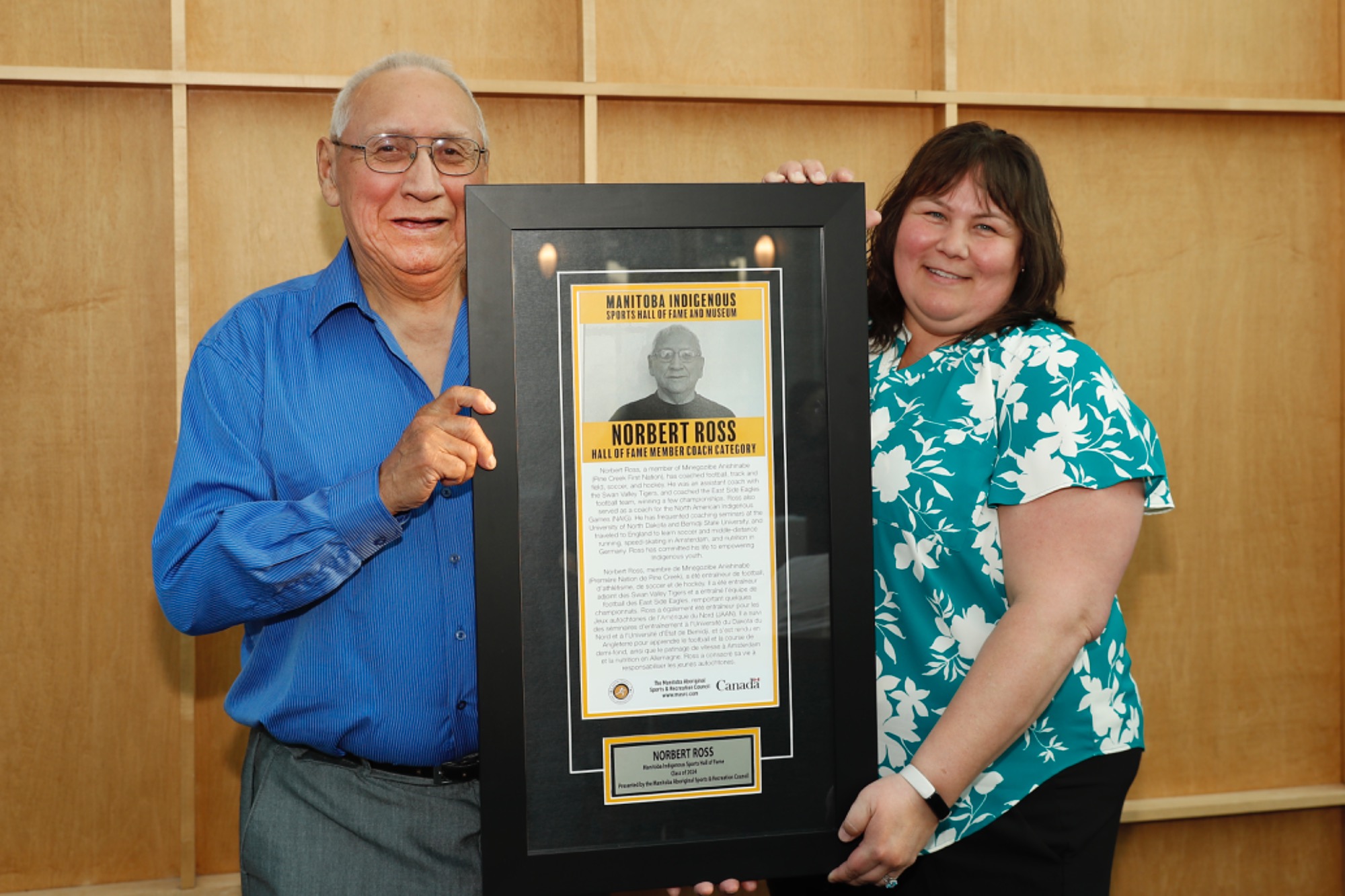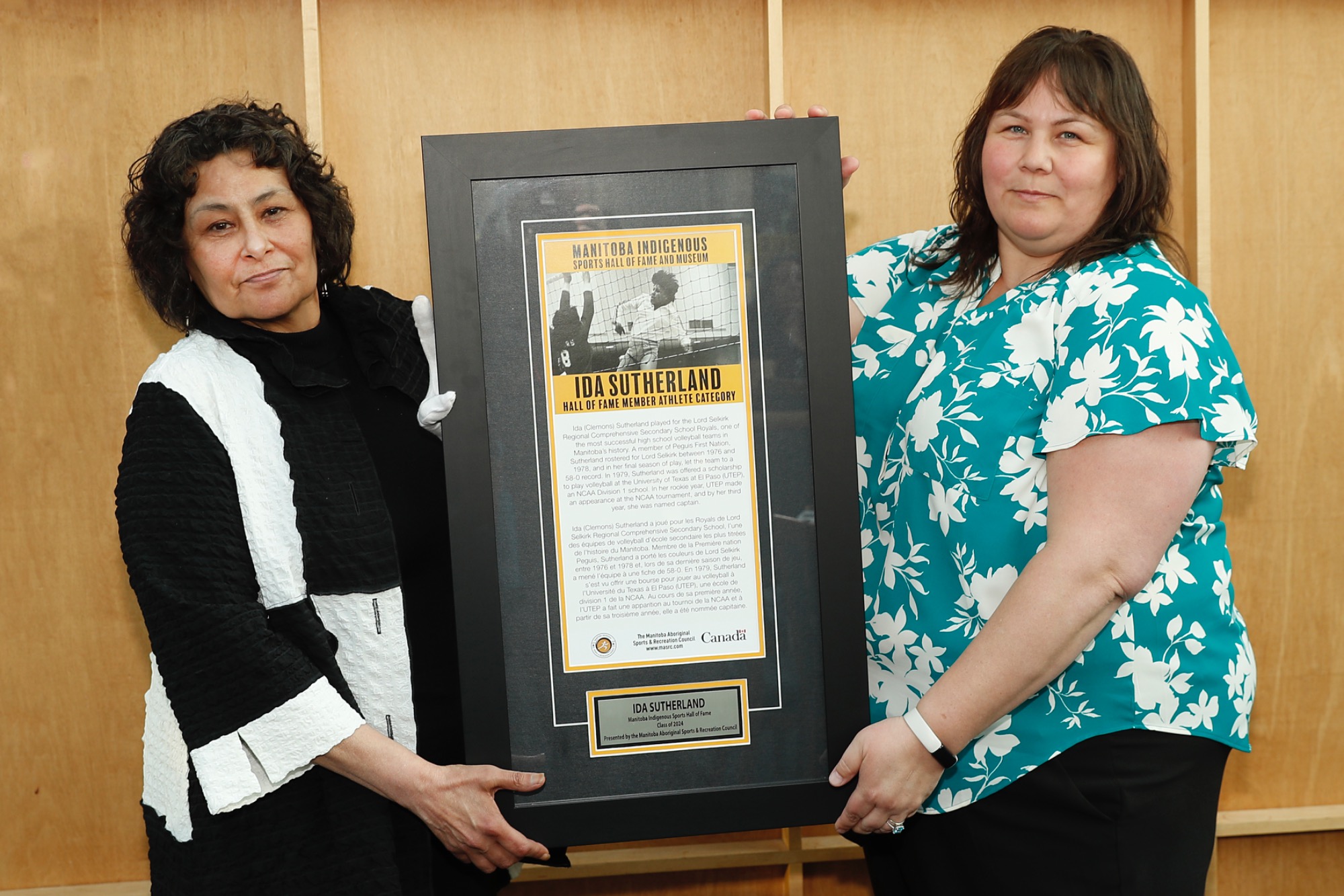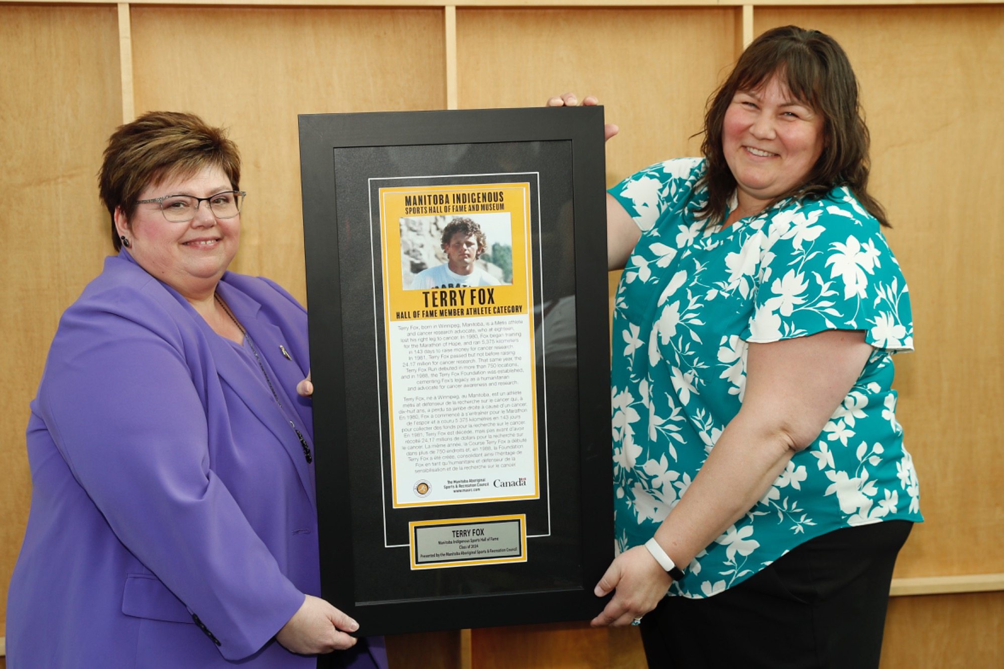 MLA of Seine River Billie Cross accepting Class of 2024 Inductee Terry Fox's plaque on behalf of the Fox family presented by MASRC Board Co-Chair Jaymie Leary Balfour.