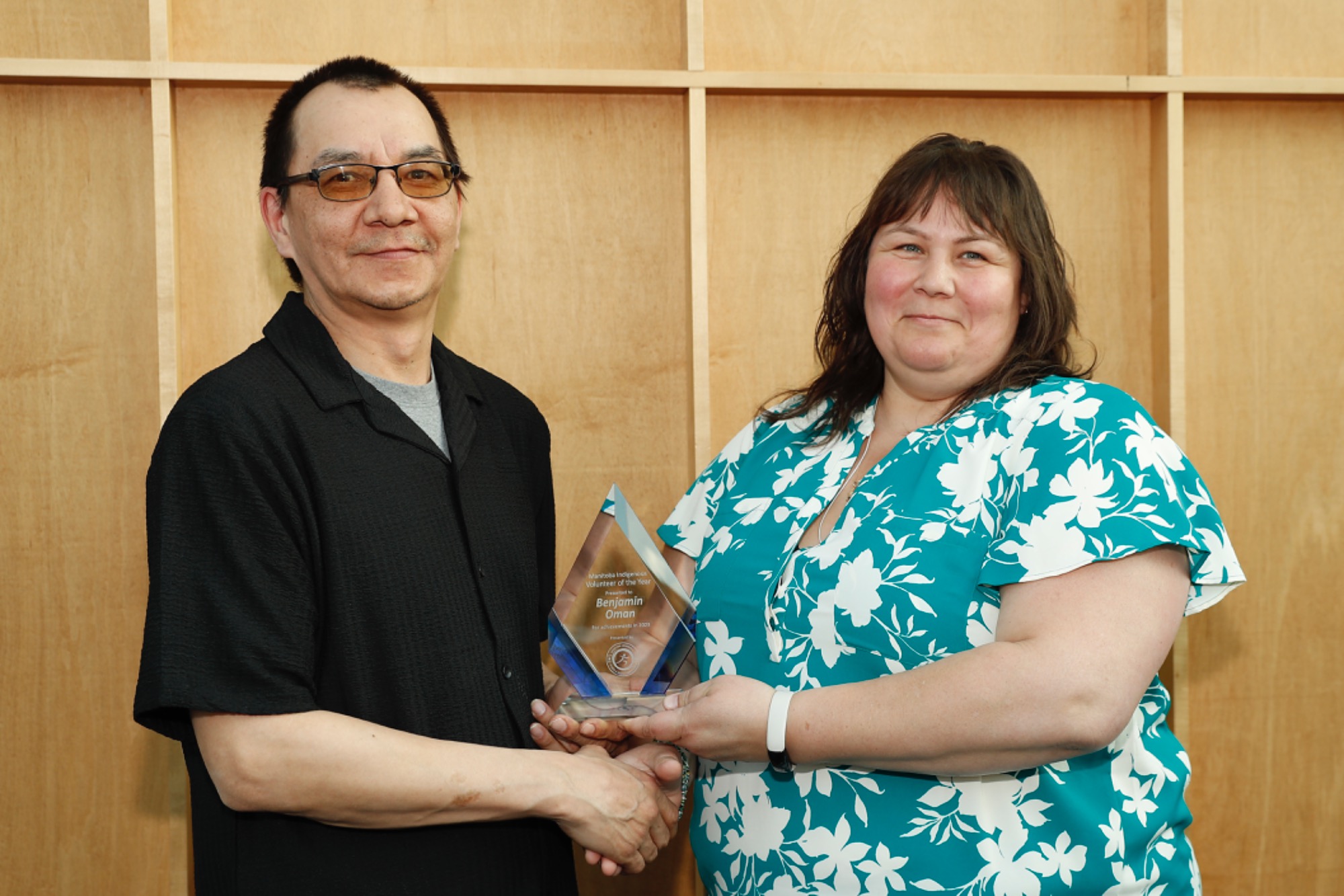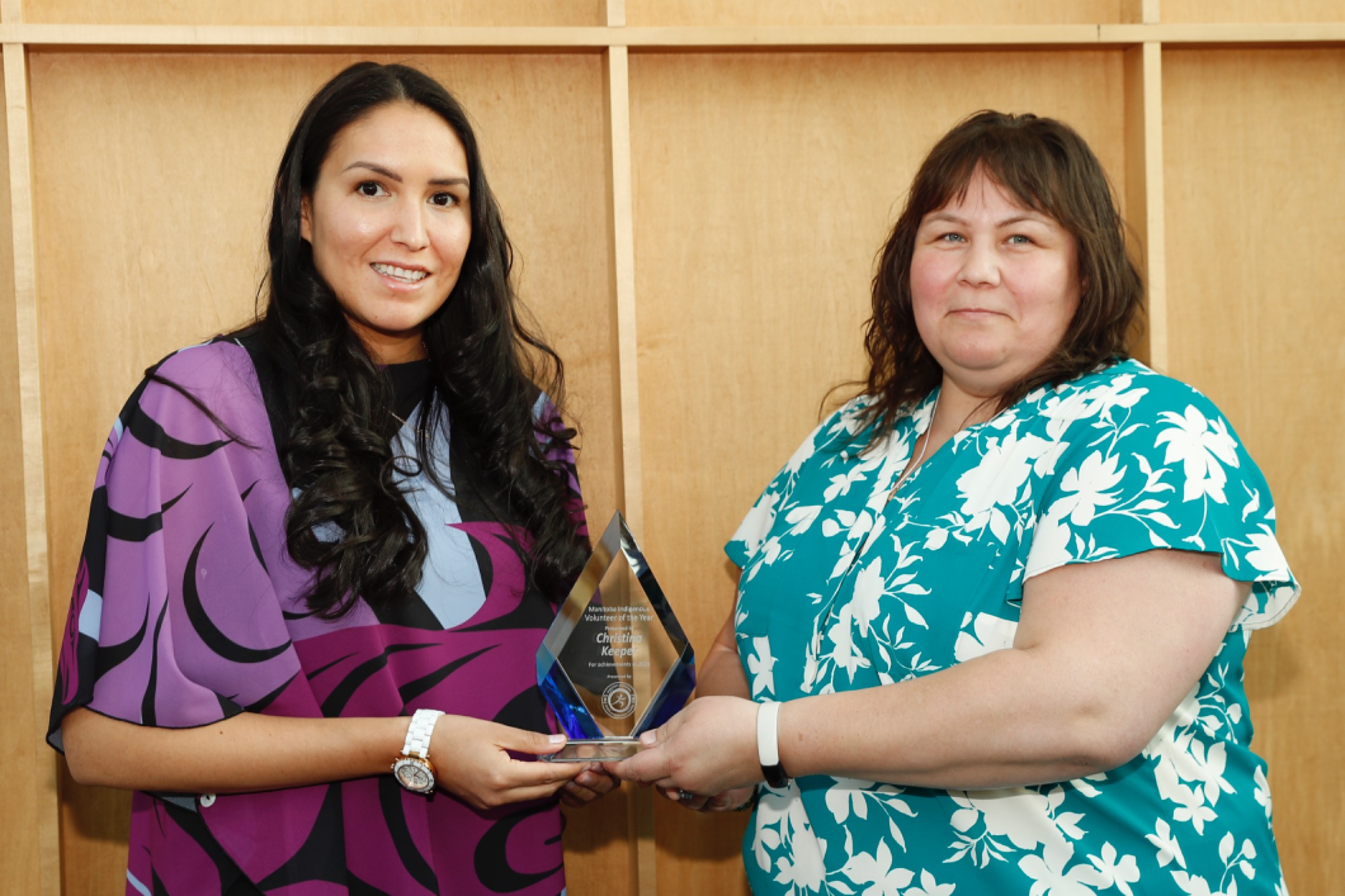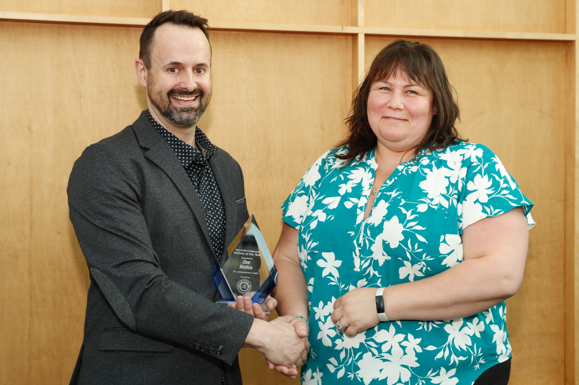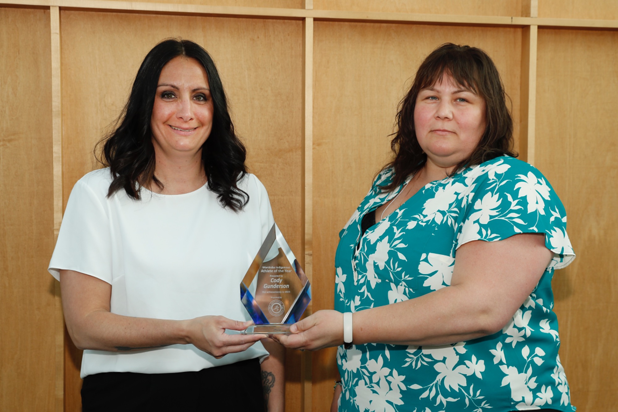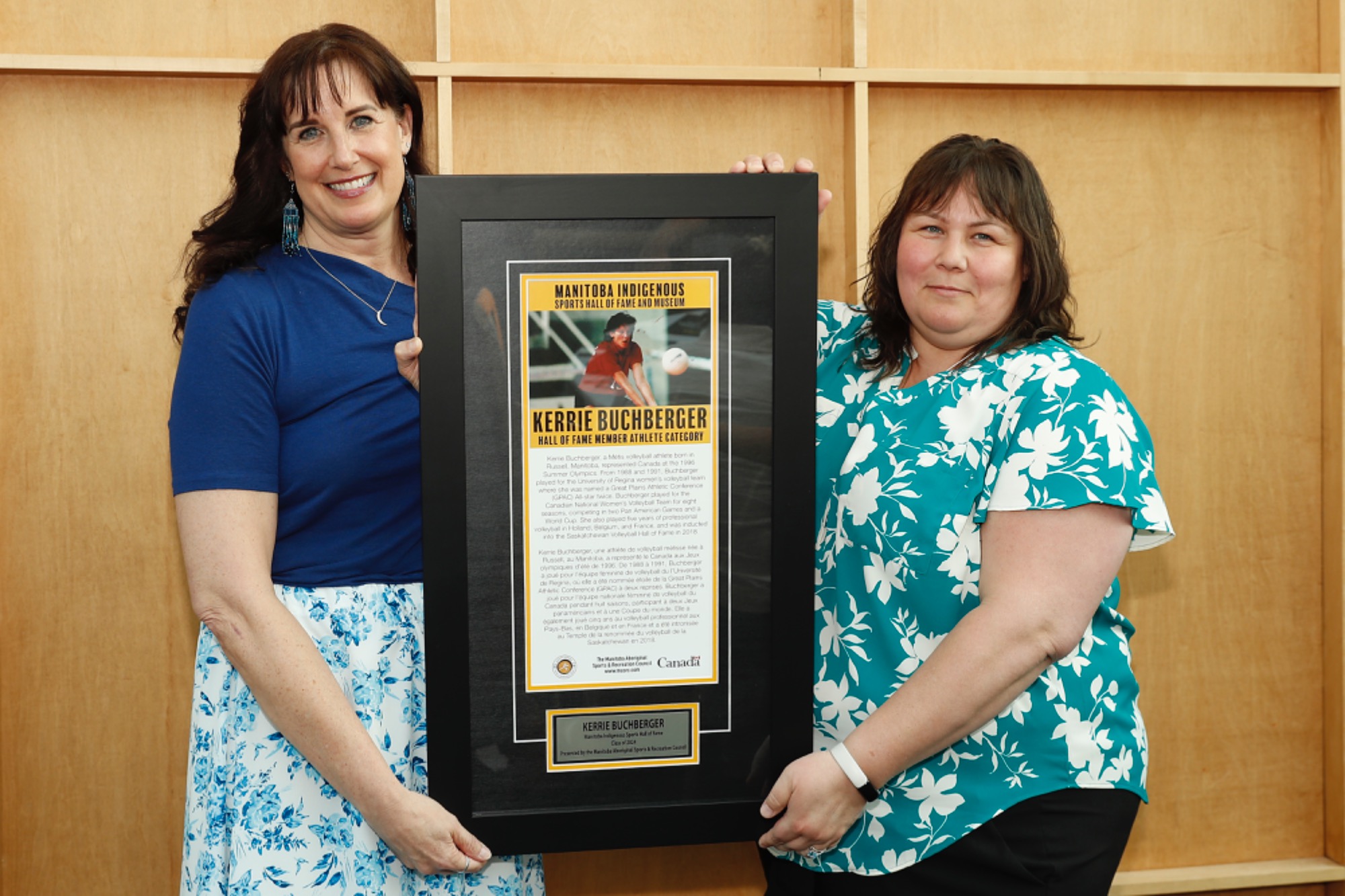 MLA of Seine River Billie Cross accepting Class of 2024 Inductee Terry Fox's plaque on behalf of the Fox family presented by MASRC Board Co-Chair Jaymie Leary Balfour.